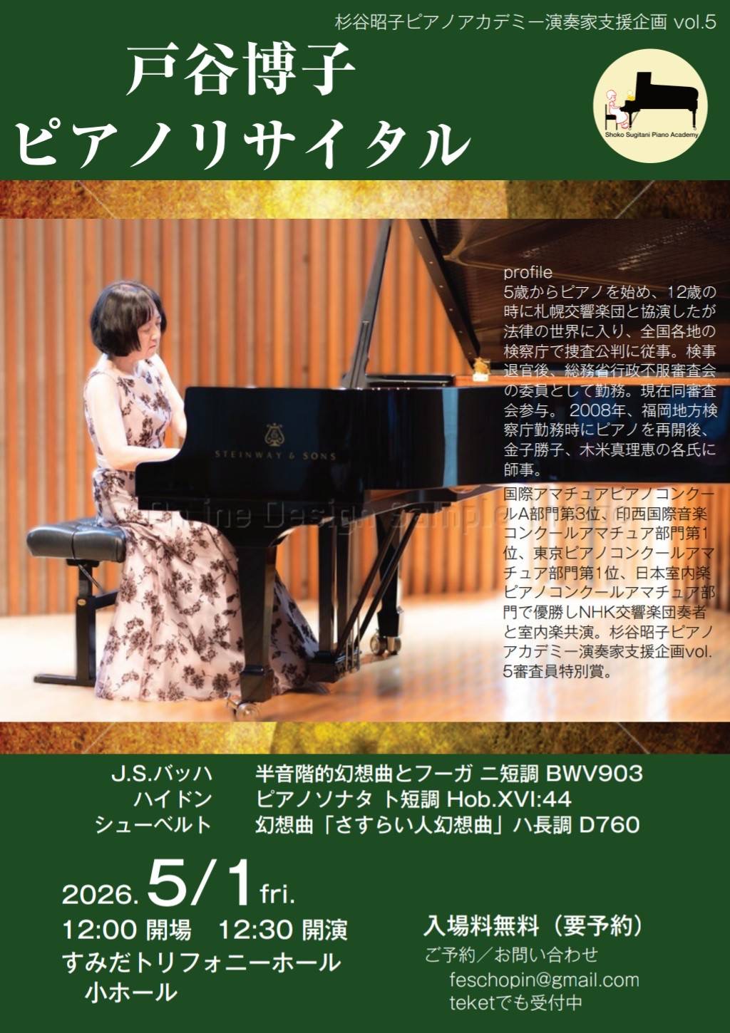 戸谷博子ピアノリサイタル X Facebook 2026.04.29 2026年5月1日(金)12:00開場/12:30開演 すみだトリフォニー小ホール 入場料無料(要予約) 演奏家支援企画vol.5 審査員特別賞を受賞された戸谷博子さんによるピアノソロリサイタルです。 7