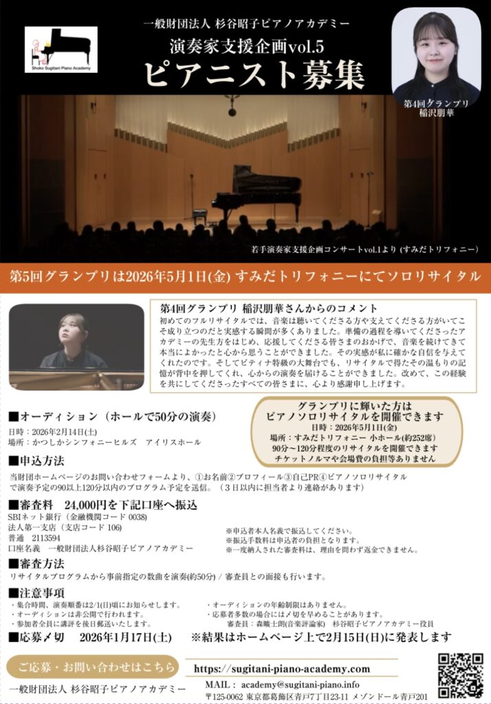 【SPA演奏家支援企画vol.5】ピアニスト募集2026 (1/17〆切)