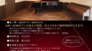若手演奏家支援の一環として、杉谷昭子記念ピアノサロンで長時間練習できる「サロン奨学生」を募集いたします。 当サロンは一級建築士でご自身もチェリストとして活動される田中渚氏が設計し、故杉谷昭子先生が所有していた5台のスタインウェイフルコンサー...